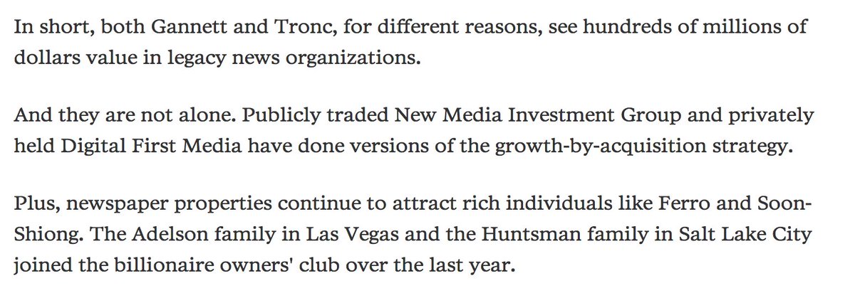 Deep-pocketed investors still see value in newspapers: http://www.poynter.org/2016/the-gannett-tronc-bidding-war-showed-us-why-people-are-still-investing-in-legacy-media/442386/ …pic.twitter.com/i81NxkgIDv