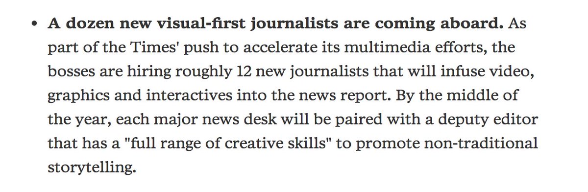The New York Times is adding a dozen visual-first journalists: http://www.poynter.org/2017/with-the-2020-report-the-new-york-times-charts-a-course-for-its-future/445460/ …pic.twitter.com/pWMVQJNhmb