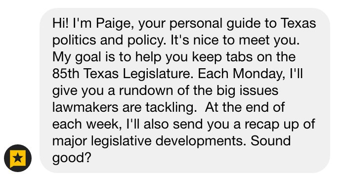 Meet Paige, @TexasTribune's Facebook Messenger bot http://www.poynter.org/2017/the-texas-tribune-is-using-a-facebook-messenger-bot-to-reach-new-audiences/452889/ …pic.twitter.com/FG4arvoeRL