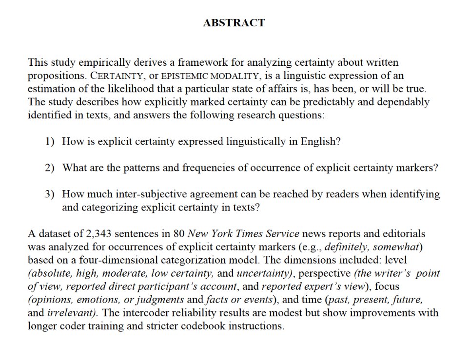 "Editorials have a high likelihood of starting and ending with an explicit certainty-qualified statement, ...