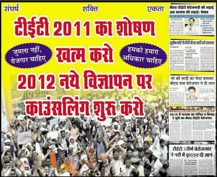 सर Up के #BEdTET2011 के बेरोजगार युवाओ की पीडा भी सुन लीजिऐ जिनको नियुक्ती दिलाने का वादा कर @BJP4UP की सरकार सत्ता मे आयी और अब #धोखा दे रही जब की सु०कोर्ट ने भी 7-12-12के विज्ञापन को सही मान कर सरकार को भर्ती की लिबर्टी दी है बेरोजगारो का 290करोड शुल्क जमा पर सरकार भर्ती रोकेहैpic.twitter.com/XTjiASAkYi