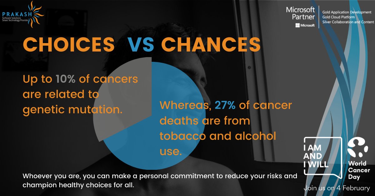 CHOICES VS CHANCES Up to 10% of cancers are related to genetic mutation. Whereas, 27% of cancer deaths are from tobacco and alcohol use. Whoever you are, you can make a personal commitment to reduce your risks and champion healthy choices for all.