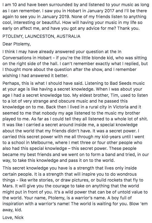 Goodness me. Nick Cave responds to Ptolemy, a 10-year-old fan:pic.twitter.com/RQdcRu5GMy