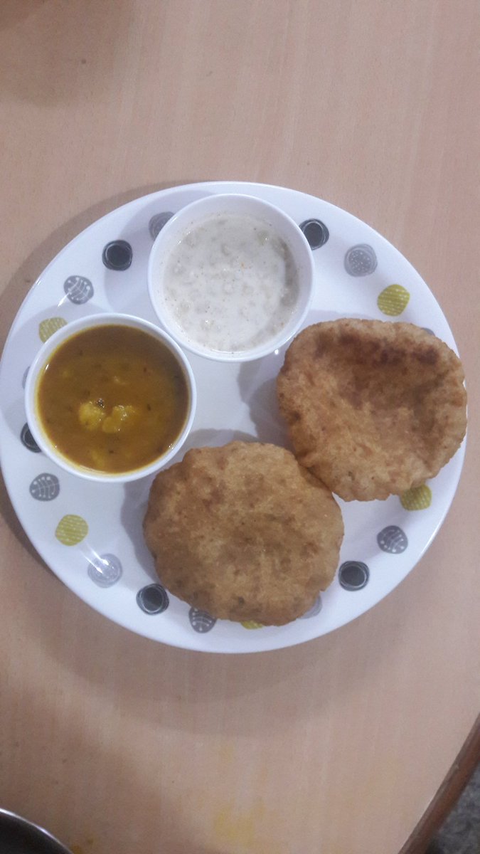 #bedmi and Aloo sabji. A paste of urad dal mixed with spices such as saunf, methi, chilli and Heeng are main ingredients. This paste is stuffed in poori. Aloo sabji was also special with spices. Accompanied with Boondi ka raita the dinner was fullsome.pic.twitter.com/CxgfsOBhM8