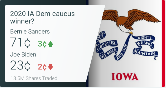 Iowa on the prediction markets: 71% - Bernie Sanders 22% - Joe Biden 10% - Pete Buttigieg 7% - Elizabeth Warren 2% - Amy Klobuchar 1% - Andrew Yang