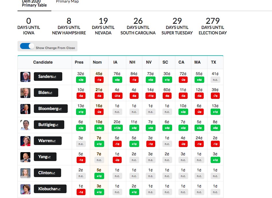 In 24 hours we will not be talking about football, but about the Iowa Caucus. The betting market continue to say it is Bernie's to lose. This table is always current (and sortable) here. https://www.biancoresearch.com/election-betting/ …pic.twitter.com/3WDRdFcYeF