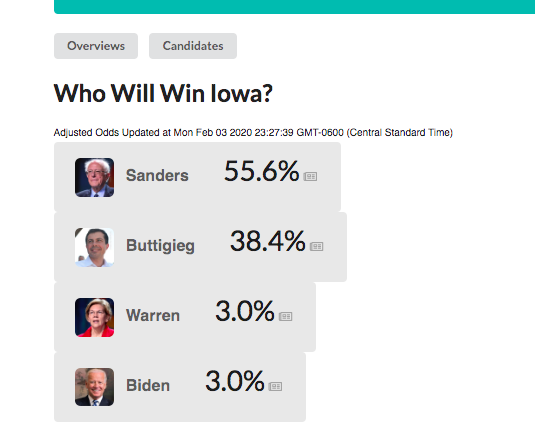 @PredictIt markets look like Bernie has an Iowa victory locked. Biden is underperforming and Mayor Pete is having a better turnout than expected.@PeteButtigieg@JoeBiden@BernieSanders#IowaCaucusespic.twitter.com/JpIuBwn6iW
