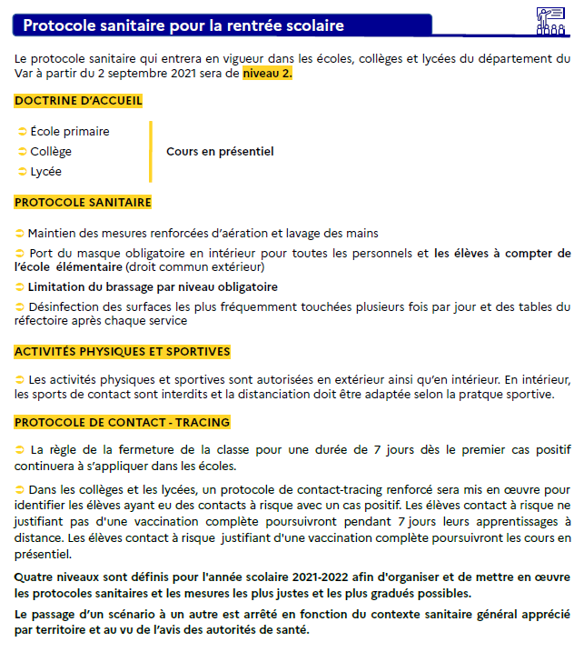 #Covid19#Rentrée2021 | Bonne rentrée à tous! Le protocole#sanitaire en vigueur pour la rentrée scolaire dans les écoles, collèges et lycées du#Var est de niveau