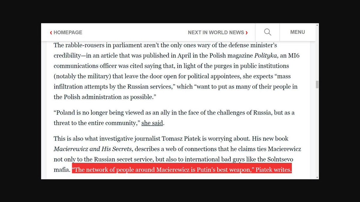 P. @PremierRP @BeataSzydlo rozumiem, iż był obecny wątek #ThomasPiatek "The network of people around @Macierewicz_A is Putin’s best weapon”.pic.twitter.com/OARADxk7cD
