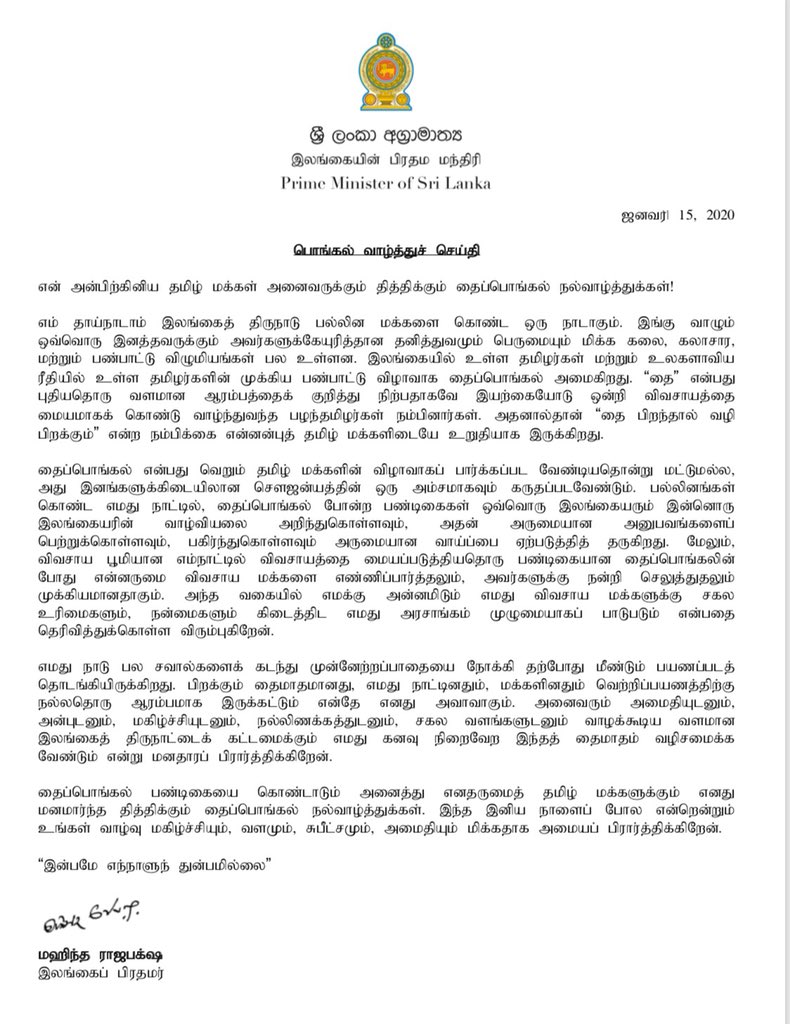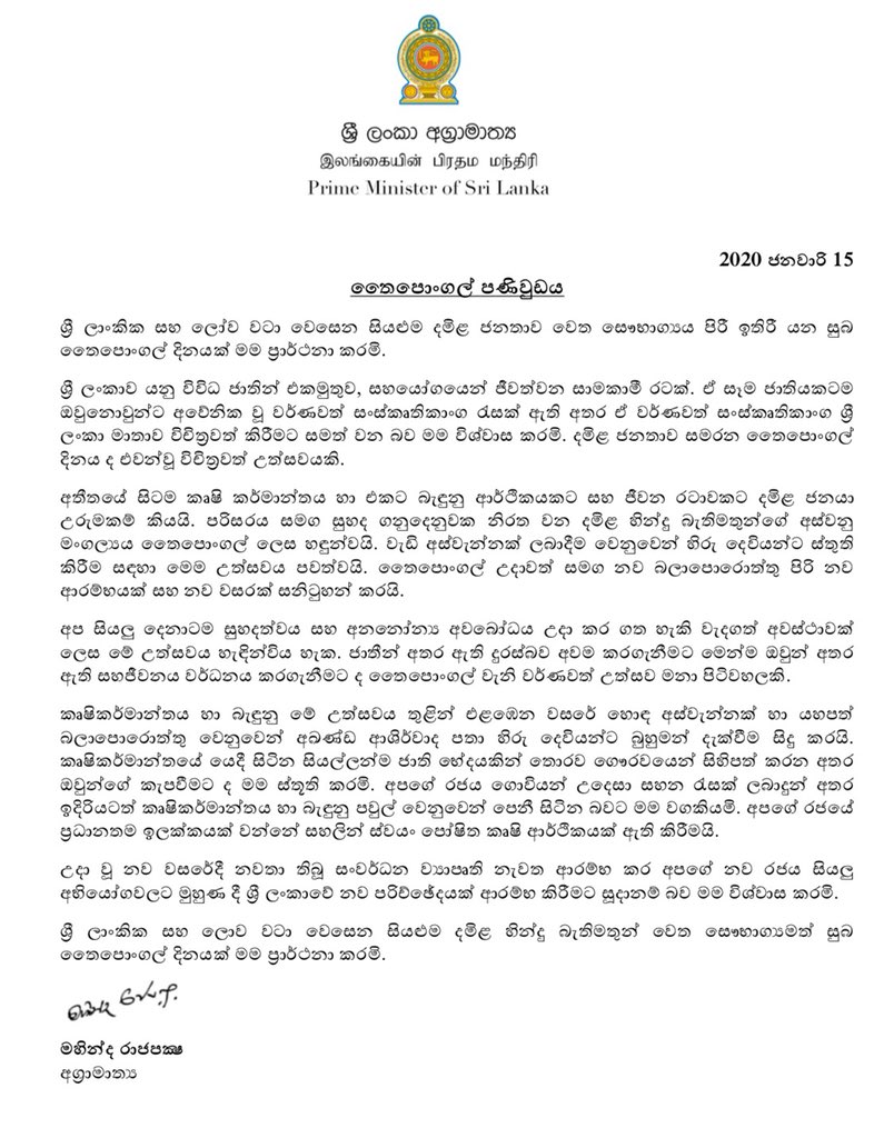 I wish the Tamil community in Sri Lanka and the world over, a delightful Thai Pongal Festival.pic.twitter.com/OKC4D6Kyo9