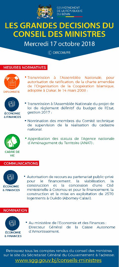 Infographie récapitulative des grandes décisions du Conseil des Ministres du mercredi 17 octobre 2018. #prbenin #wasexo #ConseilDesMinistrespic.twitter.com/tSGlc9E410