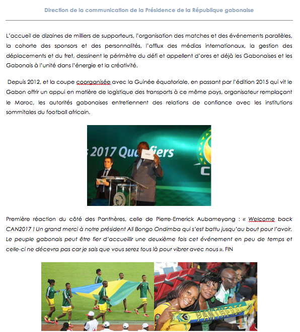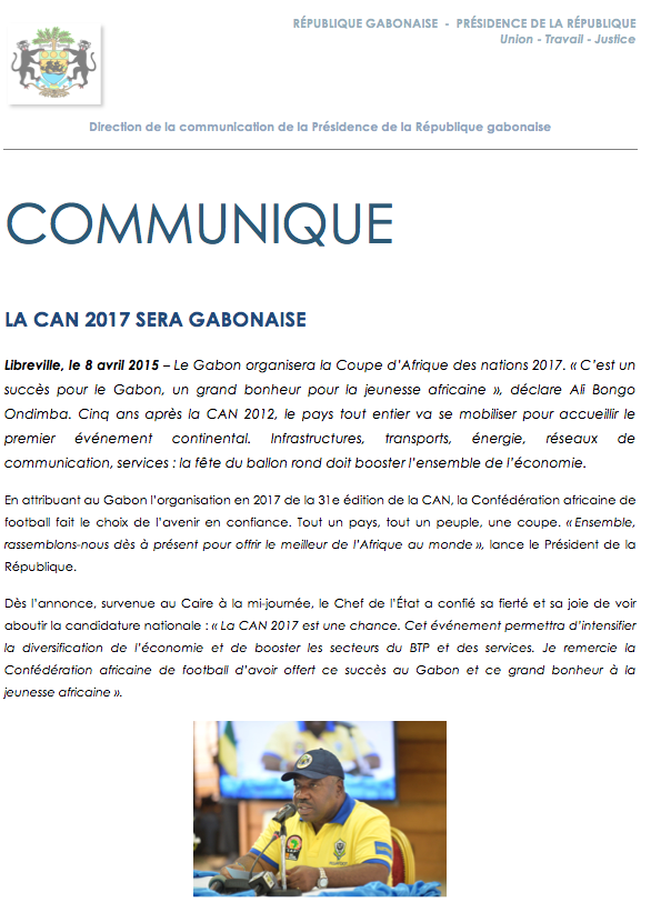 [#Communiqué] La #CAN2017 sera gabonaise ! https://fr.scribd.com/doc/261262892/Communique-de-presse-La-CAN-2017-sera-gabonaise …pic.twitter.com/lRJhmVmsVy