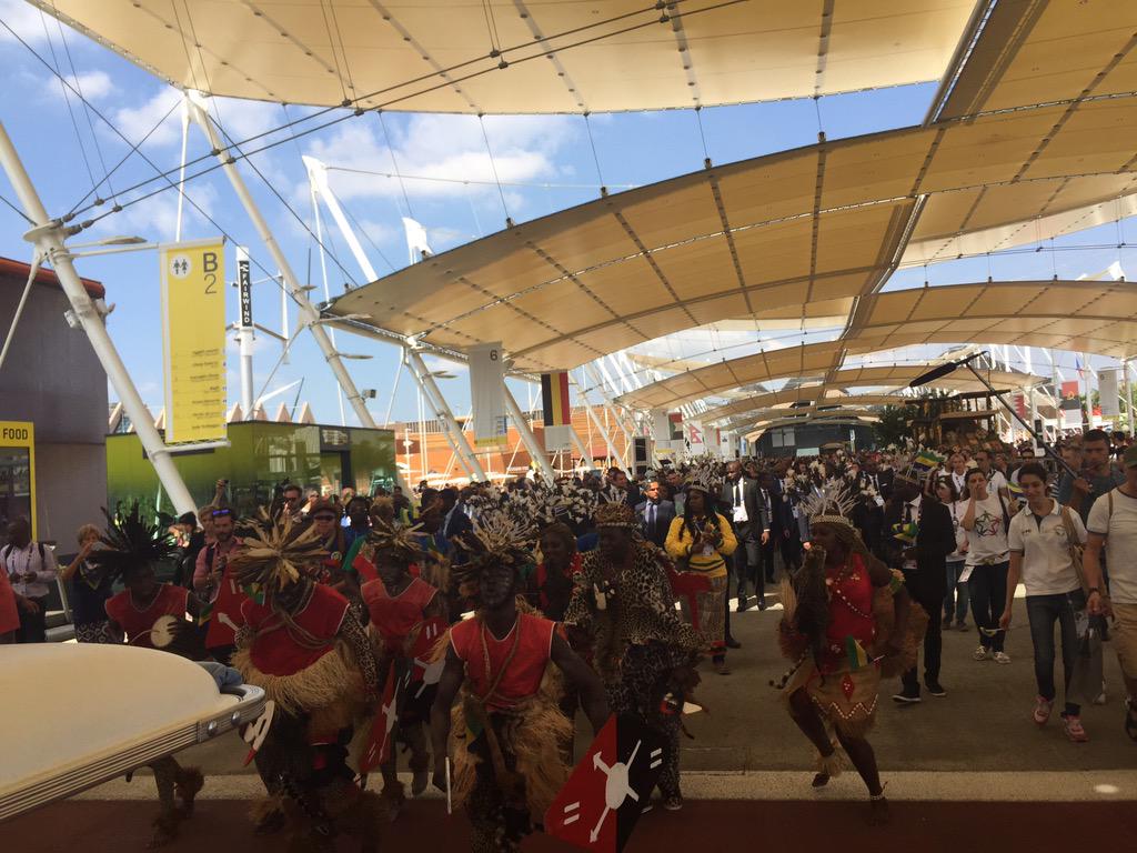 Une parade accompagne le @PresidentABO jusqu'au pavillon gabonais, dans le cluster "cacao"pic.twitter.com/6lPKX3Kl8Y