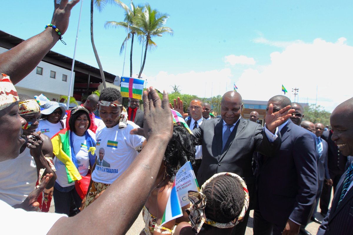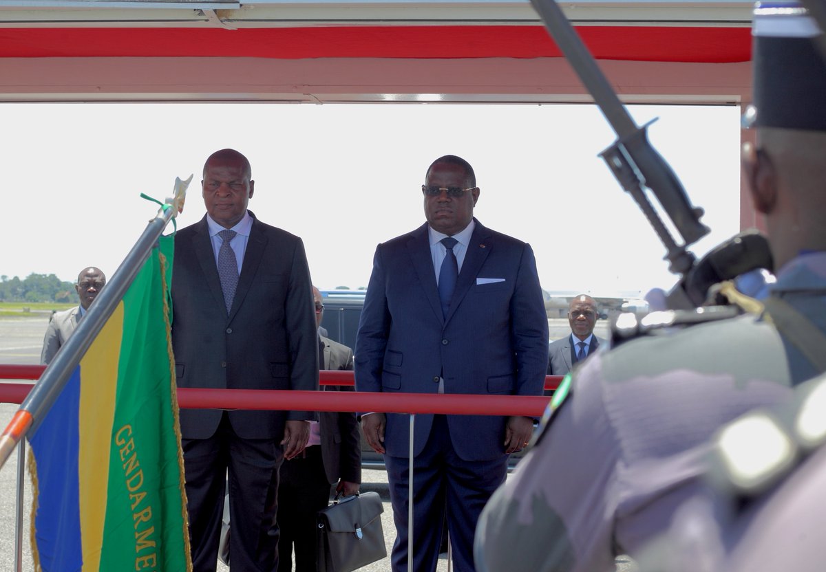 Ce matin, le Président centrafricain Faustin Archange Touadéra est arrivé l'Aéroport de Libreville, où il a été accueilli par le PM @E_IssozeNgondet, avant de se rendre à la @PresidenceGA pour un tête à tête avec le @PresidentABO