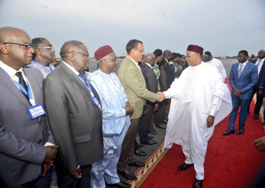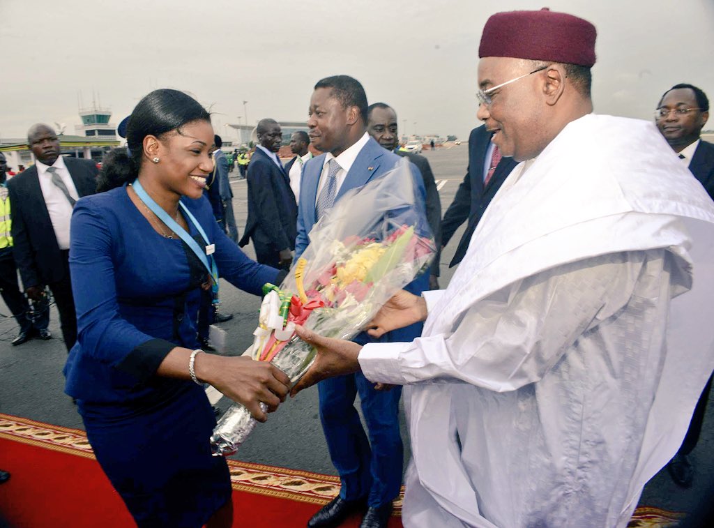 Le Président de la République SEM @IssoufouMhm a été accueilli avec tous les honneurs, à la passerelle de l’avion, par le Président togolais SEM @FEGnassingbe, Président en exercice de la #CEDEAO.pic.twitter.com/NO7xmJLrpK