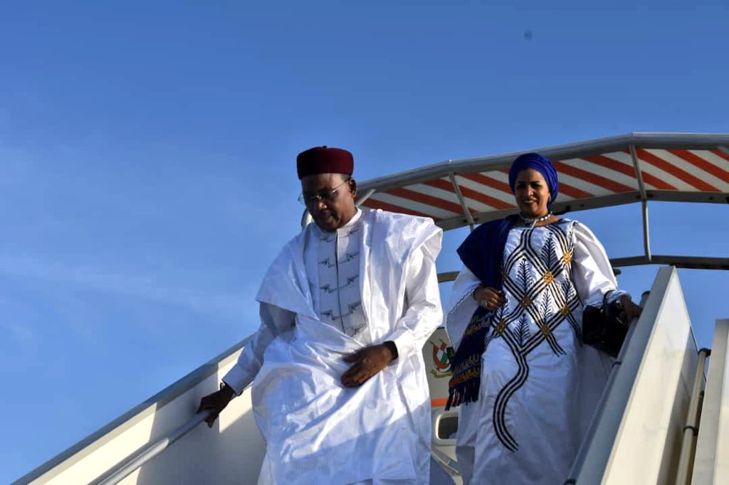 A son arrivée à l’aéroport de #Nouakchott, le PR, accompagné de la Première Dame Dr Lalla Malika Issoufou, a été accueilli à la passerelle de l’avion présidentiel par son homologue, SEM Mohamed Ould Abdel Aziz, accompagné de la Première Dame de Mauritanie, Mme Mariem Mint Ahmed.pic.twitter.com/fVVUrpkGjJ