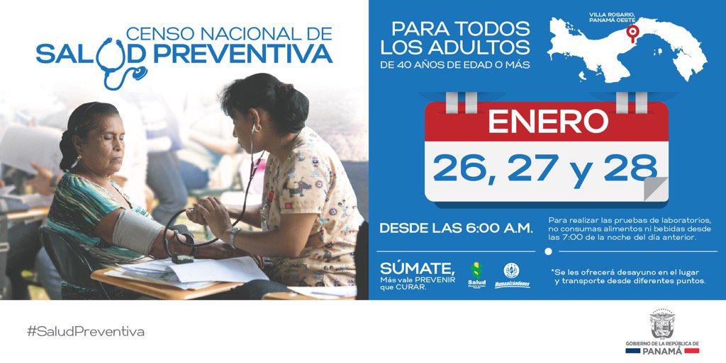 Atención Panamá Oeste: El censo de #SaludPreventiva se estará realizando en Villa Rosario este 26, 27 y 28 de eneropic.twitter.com/F2AmxqWHet