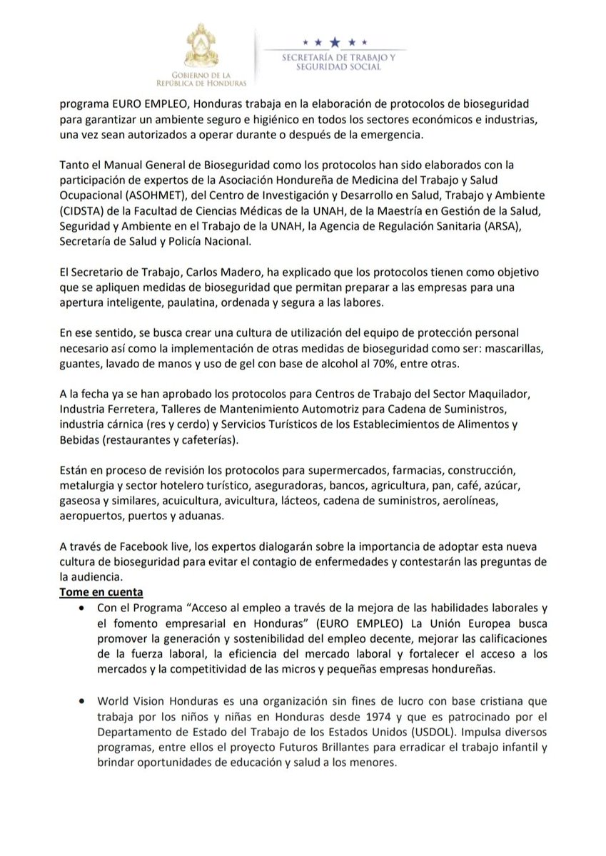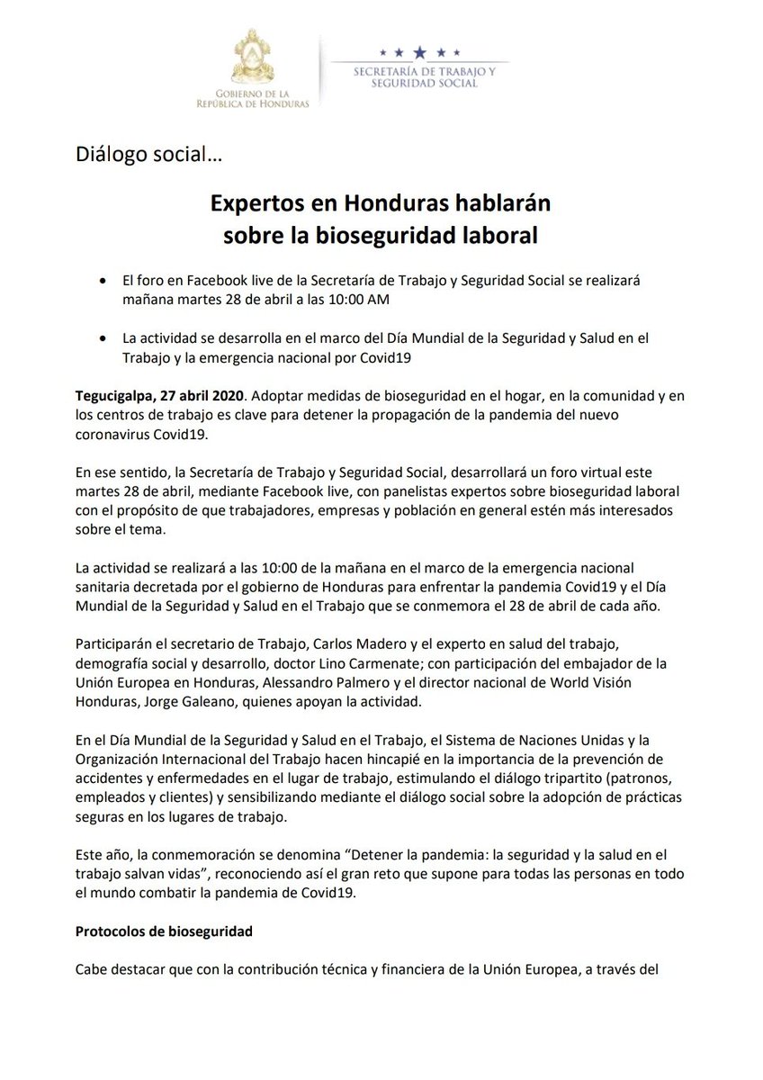 #Honduras hablarán sobre la bioseguridad laboral:#HondurasQuedateEnCasa