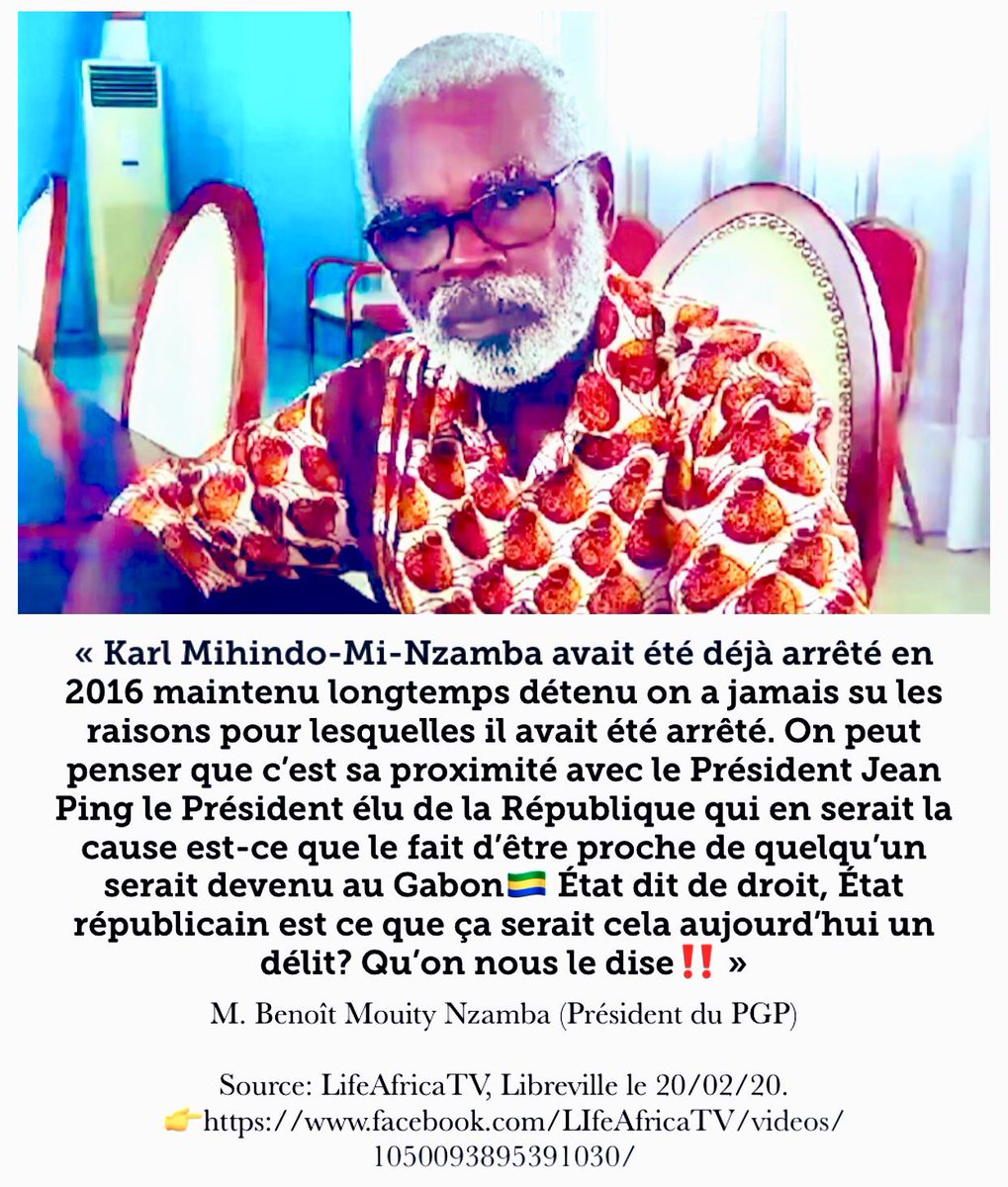 Le Président du PGP, M. Benoit Mouity Nzamba réagit suite à l’#ArrestationArbitraire de leur fils#KarlMihindounMiNzamba survenue ce 18.02.20 à Libreville#Gabon