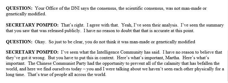 Please expound! Pompeo was being interviewed real time and contradicted himself in a matter of minutes. He then proceeded back to his rehearsed speech about China creating the virus