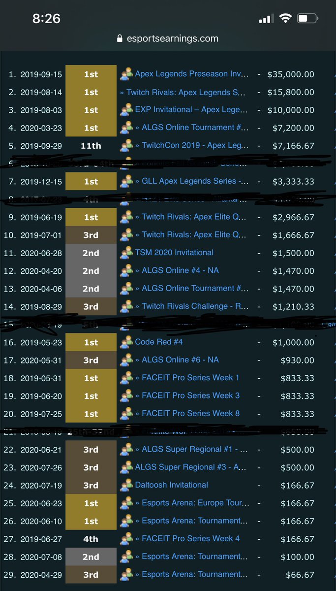 Idk whats crazier. The fact that @TSM_ImperialHal is the 1st person to pass $100k earned in Apex or that it took 25 EVENTS with an AVERAGE PLACEMENT OF 2.24 to do this 😟pic.twitter.com/JSZdpB944Z