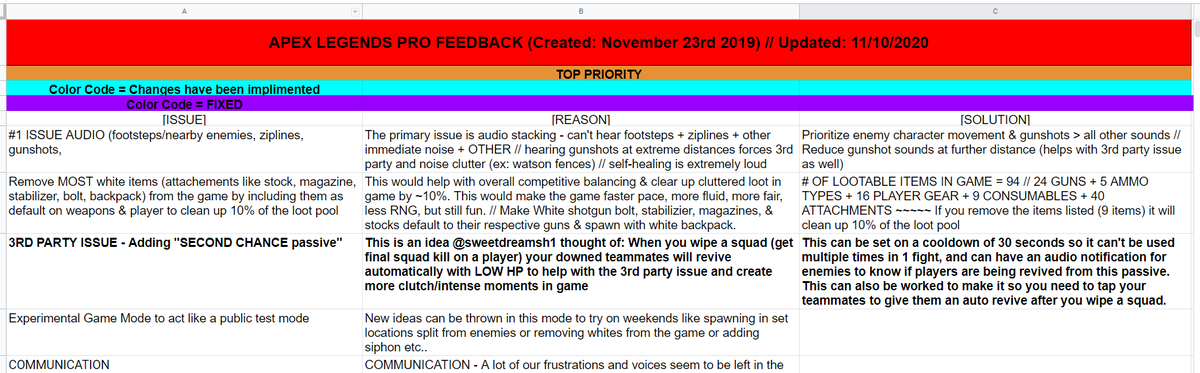 Apex Feedback Document = UPDATED Link = https://docs.google.com/spreadsheets/d/1ntXRCy0uLUFYvUFRuAx-yC7udnYX40Bnf8yKQnX6ZKI/edit#gid=0 … If you have any feedback / ideas let me know. Reading all with an open mind @lowkeydbjosh & team will be looking at this!pic.twitter.com/GZh4jlG47x