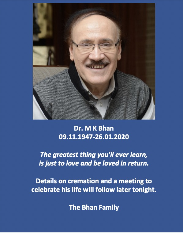 Dr. M. K. Bhan passed away a short while ago. A great pediatrician and humanist, foremost. A clinician scientist who pioneered a rotavirus vaccine, excellent science administrator, leader of complex missions in health and nutrition, a dear friend. Too sudden and too soon.pic.twitter.com/wp3V3ubhTC
