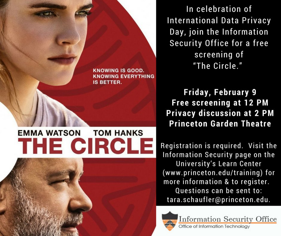 #PrincetonU's Information Security Office is hosting a free screening of "The Circle" starring Emma Watson and Tom Hanks, followed by a discussion on privacy this Friday at 12pm: http://ow.ly/bkUg50glO5O pic.twitter.com/zs3Dl0QOnv