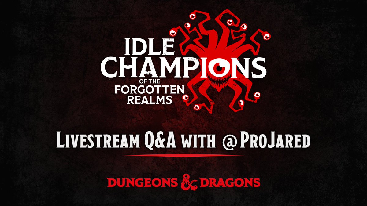 The @idlechampions Livestream starts in 10 min! Come join @dylanwilks while he hosts @ProJared for a Diath Q&A and also to talk about video games because we all love video games and why aren't we talking more about video games? http://twitch.tv/dnd  @Wizards_DnD #dndgames #dnd pic.twitter.com/oHhzpI7CtC