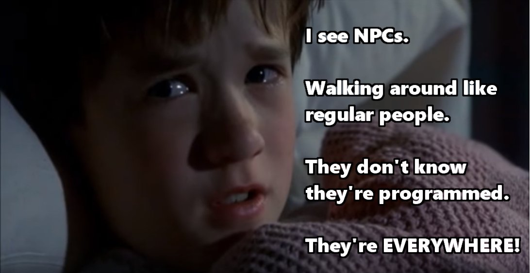 @Grummz has definitely plucked a nerve with his NPC thread on this subject. Think there are definitely some folks who are beginning to question their intellectual autonomy. And more than some who are (of course) outraged at the thought that they have no agency -