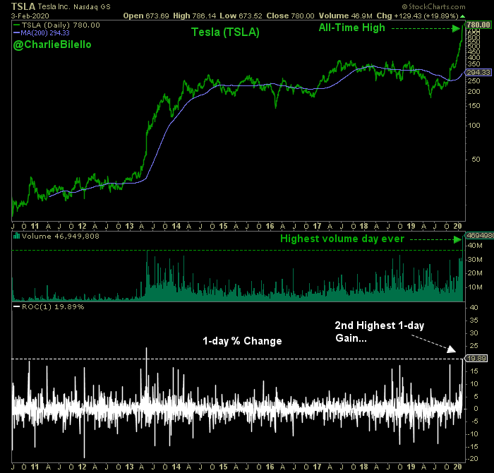 Tesla today... 1) +20%, its 2nd largest 1-day gain. 2) >46 million shares traded, highest volume day ever. 3) Gained $23 billion in market cap, passing Lockheed Martin, Broadcom, Union Pacific, IBM, Amgen, Philip Morris, United Tech, Accenture, PayPal, Eli Lilly, & Costco.