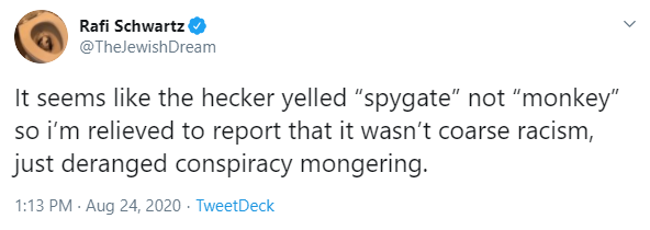 This is false. He shouted "spygate." https://twitter.com/TrumpWarRoom/status/1297948239002574848 …pic.twitter.com/JMY6fjusUg