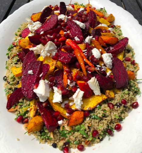 Monday lunch - Herbie quinoa with roasted beetroot, squash, carrots, pomegrantes and goats cheese......eat the rainbow!