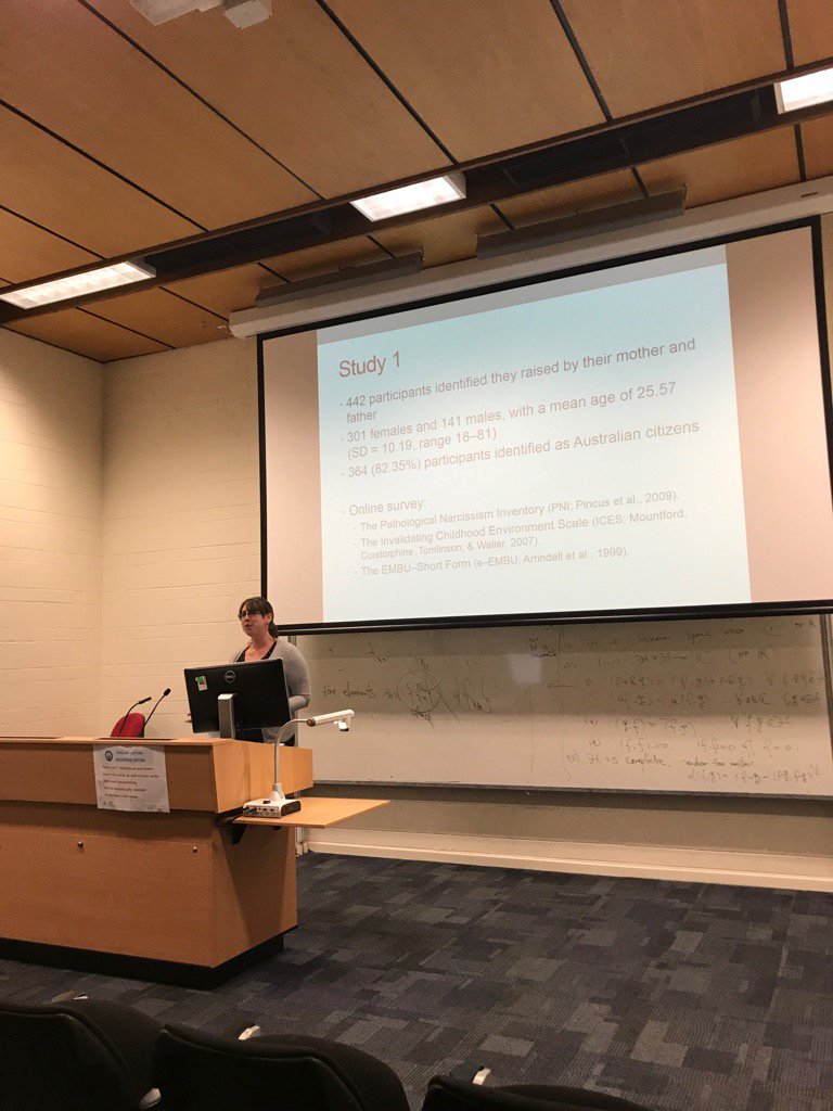 Elizabeth Huxley, a RSP PhD (Clinical Psychology) scholar, talking about factors in the development of narcissism.pic.twitter.com/4oNGEs9dLy
