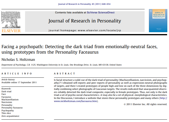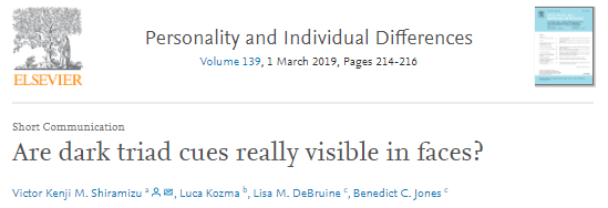 some success here "Participants correctly identified high-narcissism male and female prototypes and high-psychopathy male prototype significantly more often than expected by chance...no evidence participants could discriminate between high- and low-Mach" https://www.sciencedirect.com/science/article/abs/pii/S019188691830607X …pic.twitter.com/2okLG5r6Gr