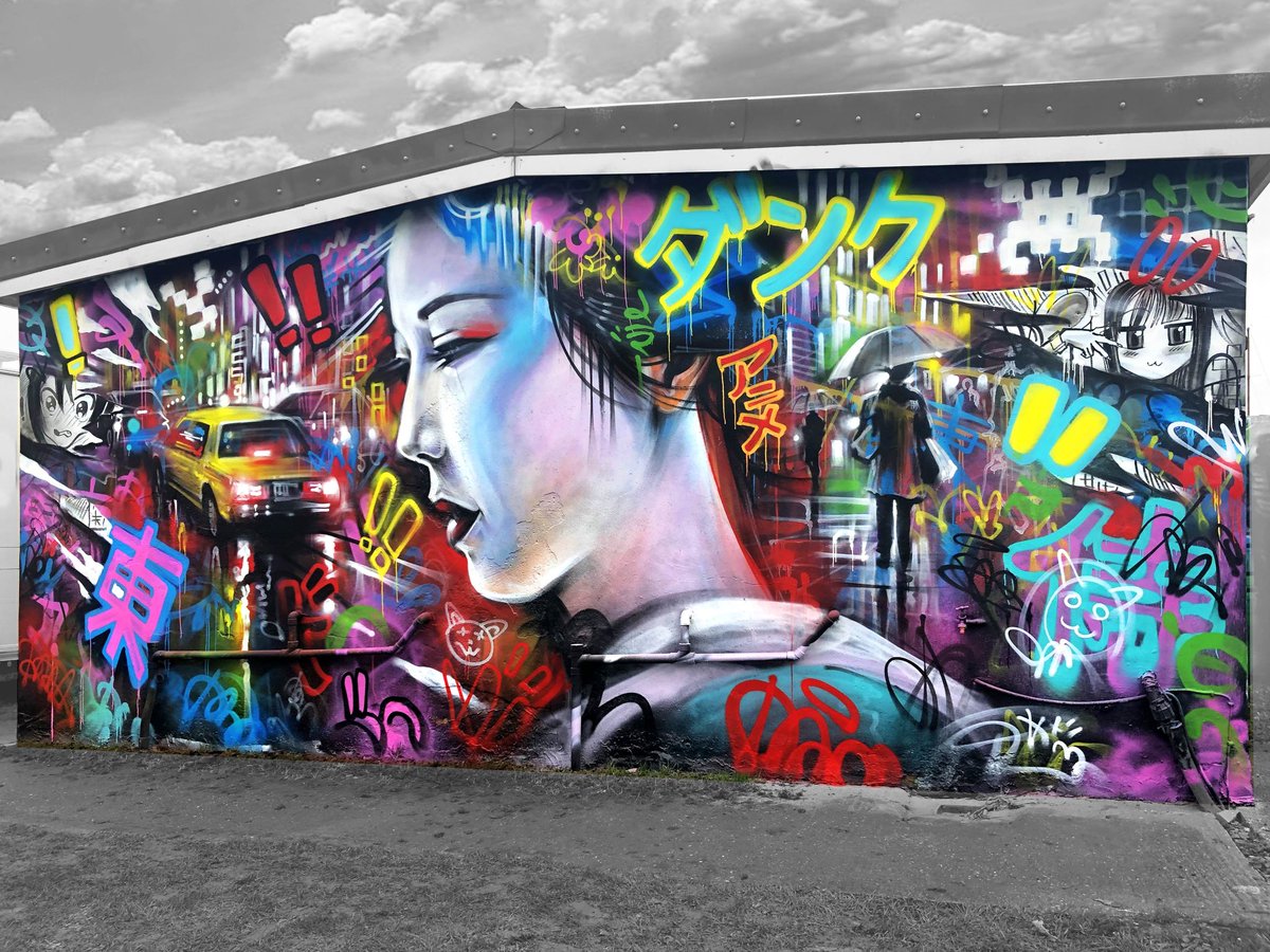 'Tokyo Dreams' - Here's my latest mural, at my secret studio location in deepest, darkest Essex! It's a crazy, chaotic mixture of so many of my Japanese influences, things I have grown up with, combined with a street art textural aesthetic. http://YouTube.com/dankitchener pic.twitter.com/6B4GKtL8ZP