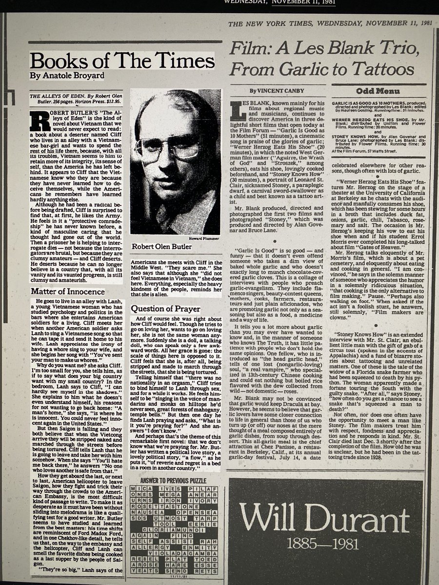 40 years ago today was publication day for my first novel, The Alleys of Eden. At that time, arguably the most feared--indeed, the most discerning--book critic in America was the daily New York Times reviewer, Anatole Broyard. On pub date, he wrote this review. And so it began.pic.twitter.com/HBEZtlCqd4