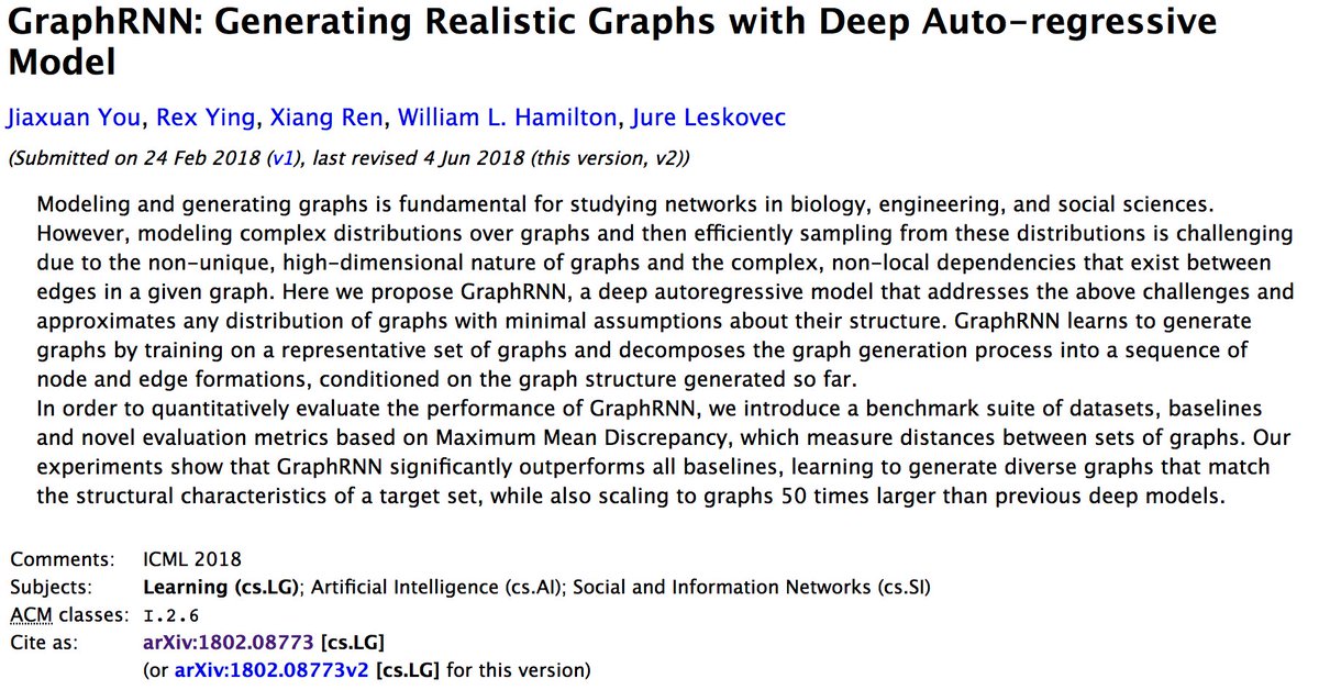 @youjiaxuan, R. Ying,@xiangrenUSC,@williamleif, and@jure#ICML2018 Paper: https://arxiv.org/abs/1802.08773@PyTorch Code: https://github.com/JiaxuanYou/graph-generation … Unofficial Slides: https://duvenaud.github.io/learn-discrete/slides/graphrnn.pdf …pic.twitter.com/8cg7JobrX2