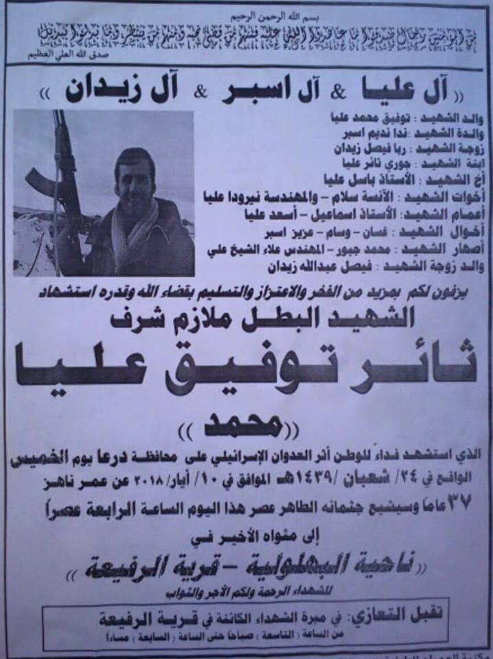 #Syria: military fatalities due to yesterday's#Israel|i bombardment rose to 6. 2nd one was a Captain from#Masyaf area.pic.twitter.com/0yqWsQcp6H