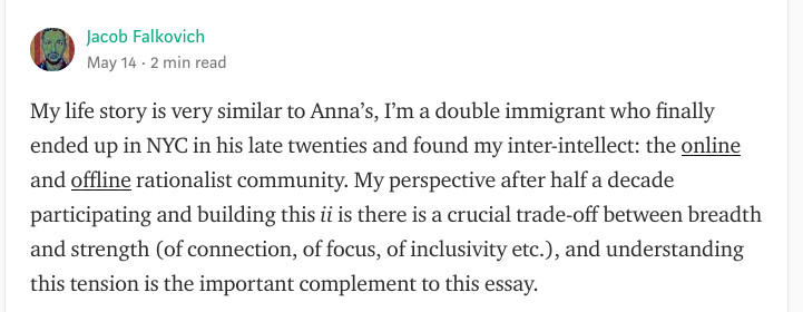 @yashkaf's comment on the original post illustrates this very confusion: (And probably we need terms for both of these things! The rationality community represents a relatively successful precursor to what Anna & other ii folks are trying to do here!) https://medium.com/@yashkaf/my-life-story-is-very-similar-to-annas-i-m-a-double-immigrant-who-finally-ended-up-in-nyc-in-his-e1b5fbc93b85 …pic.twitter.com/GlDUJJUBWd