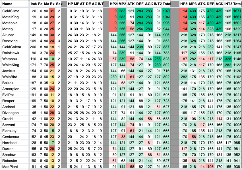 i spent somewhere between 4 and 8 hours the last few days using this information to create a conditionally formatted spreadsheet of each monster's stats at level 20 and level 30 for planning purposes and i love it so much. here they are ranked by total stats at level 30pic.twitter.com/kQQZvXNfeD