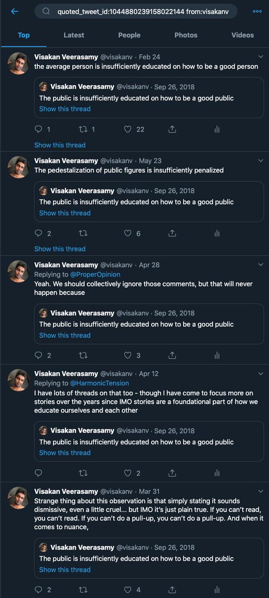 What’s the point of this? There are all sorts of cool possible implications. One is that you can do a “reverse thread”. Ie by quote-tweeting the same X tweet in reply to other tweets, you can search quoted_tweet_id:X to generate a list of things you replied X to