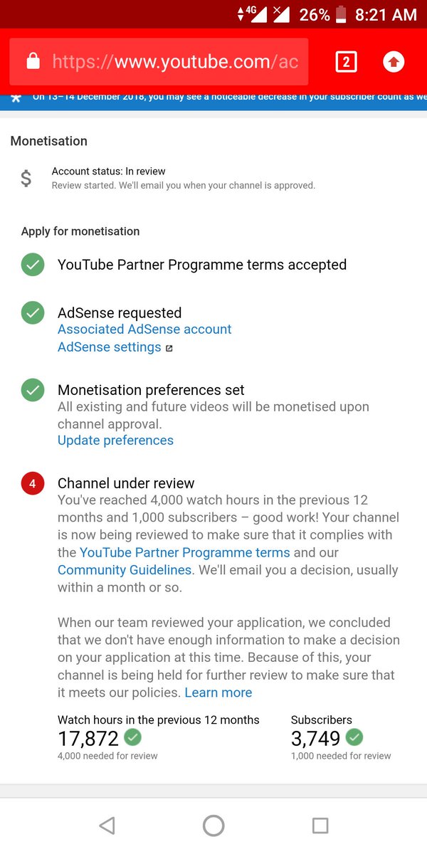 For us to understand this better, please share the screenshot of the monetization page: https://goo.gl/vqci8A ? Keep us posted.