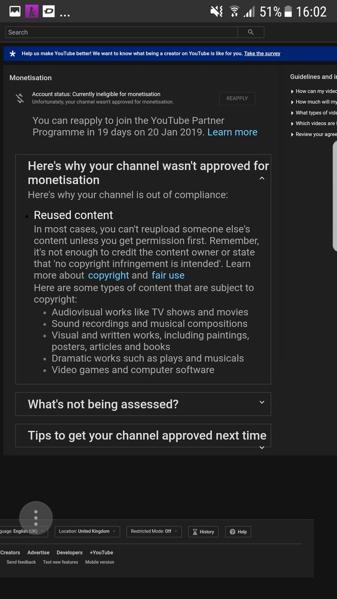 @TeamYouTube when reapply I will have to wait for months so I quit I will not be reapply I do not want to wait months again I can't believe this happendpic.twitter.com/Fuy58xvYCk