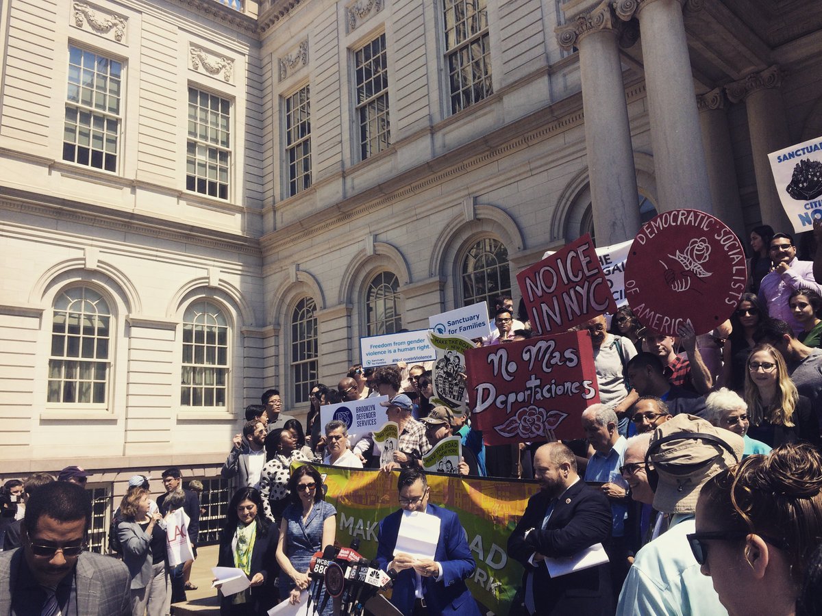 Our Immigration Justice @nycDSA members at a City Hall press conference calling for an end to ICE in our courts. Photo by @melissagira.pic.twitter.com/S6Lr2Ao7Yf