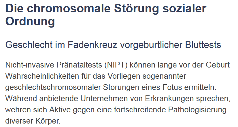 CN: Eugenetik Die Diskriminierung von Körper, die gegen die geschlechtliche Binarität verstoßen findet auch schon vor der Geburt statt. Deswegen ist es wichtig das die Gesellschaft als ganzes über Intersexualität aufgeklärt wird und diese nicht als Krankheit aufgefasst wird.https://twitter.com/HechlerAndreas/status/1433844940312825862 …