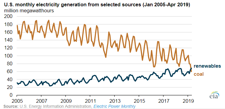 #TodayInEnergy - U.S.#electricity generation from#renewables surpassed#coal in April 2019 https://go.usa.gov/xyrU5#windenergy#solar#PVpic.twitter.com/34AHMMutgV