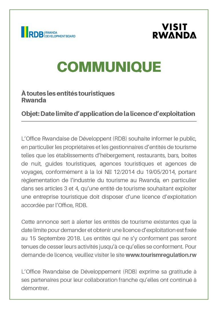 ITANGAZO Ibigo byose bikora imirimo y'ubukerarugendo birasabwa kwaka icyangombwa kibemerera gukora iyo mirimo bitarenze taliki 15 Nzeli 2018pic.twitter.com/rlGgM0ugMe