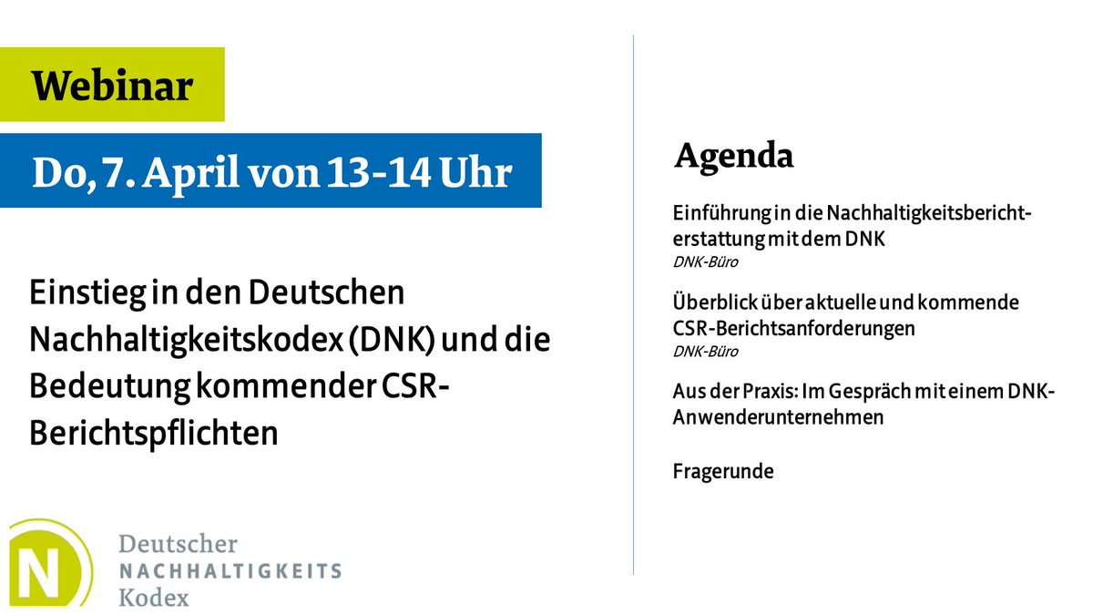 #Webinar einen Einstieg in die Nachhaltigkeitsberichterstattung mit dem#DNK und gehen auf aktuelle und kommende CSR-Berichtspflichten ein. Anmeldung: