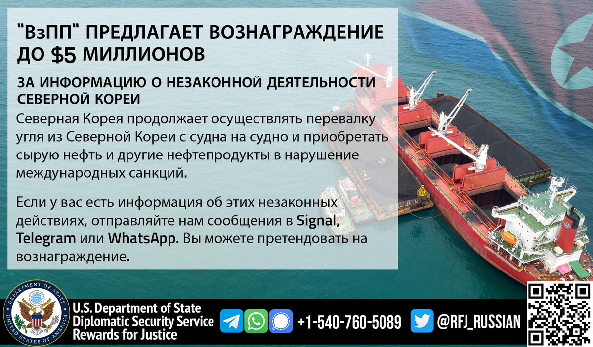 Пишите нам, если у вас есть информация о деятельности Северной Кореи по перевалке угля, сырой нефти или нефтепродуктов. Вы можете претендовать на вознаграждение.pic.twitter.com/WAG7bLyAz4